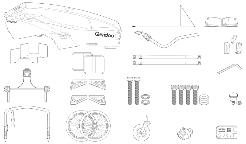 - Alle Sicherheitsanforderungen und regional geltenden gesetzlichen Regelungen müssen erfüllt sein (z. B. Beleuchtung). Der Qeridoo muss vollständig montiert und technisch einwandfrei sein. Alle Arretierungen, Gurte und Verschlüsse sind zu befestigen. Alle Schraubverbindungen sind fest anzuziehen.