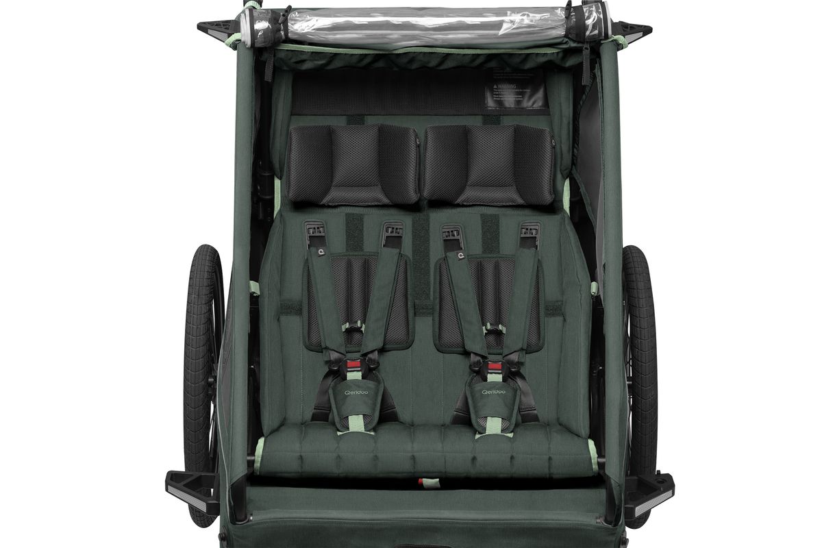 - Es dürfen maximal zwei Kinder transportiert werden. Diese sind mittels Gurtsystem gesichert und tragen geeignete Kleidung sowie einen Fahrradhelm. Es ist für eine ausgeglichene Lastverteilung zu sorgen.