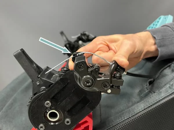 Löse die Klemme des Bremsseilhalters mittels Innensechskantschlüssel der Größe 5 und spanne den Hebel so weit vor, bis die Bremsbeläge fest auf der Bremsscheibe aufliegen. Achte darauf, dass das Bremskabel gespannt ist und korrekt in den Halterungen am Bremssattel, dem Y-Verteiler und am Bremshebel sitzt. Ziehe die Schraube am Bremsseilhalter anschließend wieder fest an.